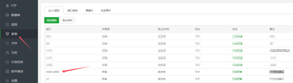 在你的宝塔面板左侧安全里面会显示FTP被动端口范围,如下图FTP被动端口范围为3000-4000