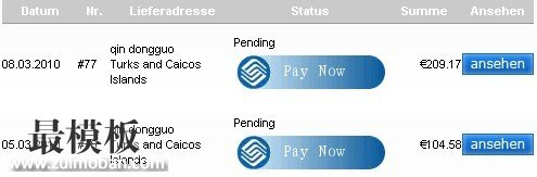 <?php //&& $orders->fields['orders_status'] == '1' if(isset($payment_modules->paynow_action_url) && $payment_modules->paynow_action_url != ''&& $orders->fields['orders_status'] == '1'){ echo('<fieldset id="csNotifications">'); echo('<legend>'.TEXT_PAYNOW.'</legend>'); echo zen_draw_form('checkout_paynow', $payment_modules->paynow_action_url, 'post', 'id="checkout_confirmation" onsubmit="submitonce();"'); $selection = $payment_modules->selection(); echo('<div class="buttonRow payment_method">'.$selection[0]['module'].'</div>'); echo('<div class="buttonRow forward paynow">'); if (is_array($payment_modules->modules)) { echo $payment_modules->paynow_button($orders_id); } echo(zen_image_submit(BUTTON_IMAGE_PAYNOW, BUTTON_IMAGE_PAYNOW_ALT, 'name="btn_paynow" id="btn_paynow"')); echo('</div>'); echo('</form>'); echo('</fieldset>'); } ?> </div> ![]() 4. 在历史订单中显示pay now按钮。需要显示pay now按钮的页面有三个:account, account_history,account_history_info,这里的实现和checkout_success页面的实现大同小异,只是传给$payment_modules的函数paynow_button的参数不一样而已,这里就不再赘述。
