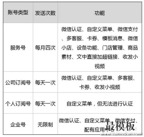 一般服务号有很强大的数据库管理系统,一周能够推送一次消息,订阅号每天可以推送一次。看你自己需求。 1、企业号:微信为企业客户提供的移动应用入口、简化管理流程,提升组织协同动作效率;帮助企业建立员工、上下游供应链与企业IT系统间的连接。 适用人群:企业、政府、事业单位或其他组织。 2、服务号:服务号开放的接口比较多,主要针对于企业、以服务功能型为主的账号,功能强大,但不需要过多推送内容,以服务为主,给企业和组织提供更强大的服务与用户管理能力,帮助企业实现全新的公众号服务平台,如招行信用卡、南方航空。很多企业也会选择服务号与订阅号同时建立来满足不同的需求主要用于服务。 适用人群:媒体、企业、政府或其他组织。 3、订阅号:主要用于推广。多是一些媒体、自媒体、公司市场、品牌、宣传使用,为媒体和个人提供一种新的信息传播方式,构建与读者之间更好的沟通和管理模式。订阅号还分个人订阅号和企业组织类的订阅号,个人号无法认证,请申请企业类的账号,才能获得更多权限和排名的优化。 适用人群:个人、媒体、政府或其他组织。 无论是选择订阅号还是服务号或者企业号,都要根据企业或个人的实际需求而定,自己的定位找好了,账号的类型也就好选了。 第五、都填写好提交后就等待审核,一般审核需要2-3天左右,通过后就可以成功的登录此服务帐号了 第六、设置微信公众号的头像和微信号,点击头像可以设置头像和微信号,方便用户查找
