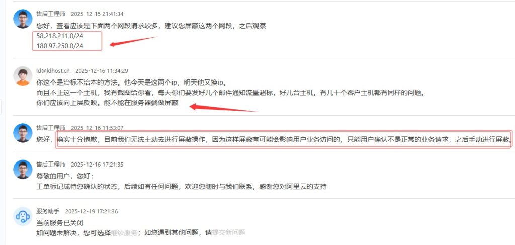 经多次向阿里云反映,有次阿里云查了一个小时,就查出2个有问题的IP,还要客户自已手动去封,太无语了,这么大的流量,这些多的超流量的网站,访问的IP应该会有几十万个,有问题的IP远远不止这二个,也不可能每个网站每天去查日志,这工作量也太大、太繁锁。