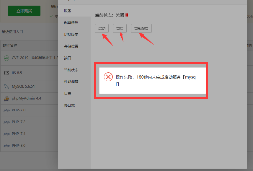 首页 > 宝塔面板 > windows服务器宝塔数据库重启不了提示:操作失败,180秒内未完成启动服务【mysql】
