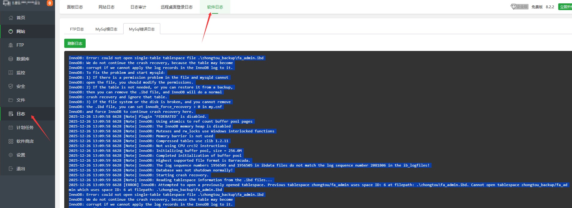 在宝塔左侧的日志>>软件日志,查看日志中数据库错误的原因