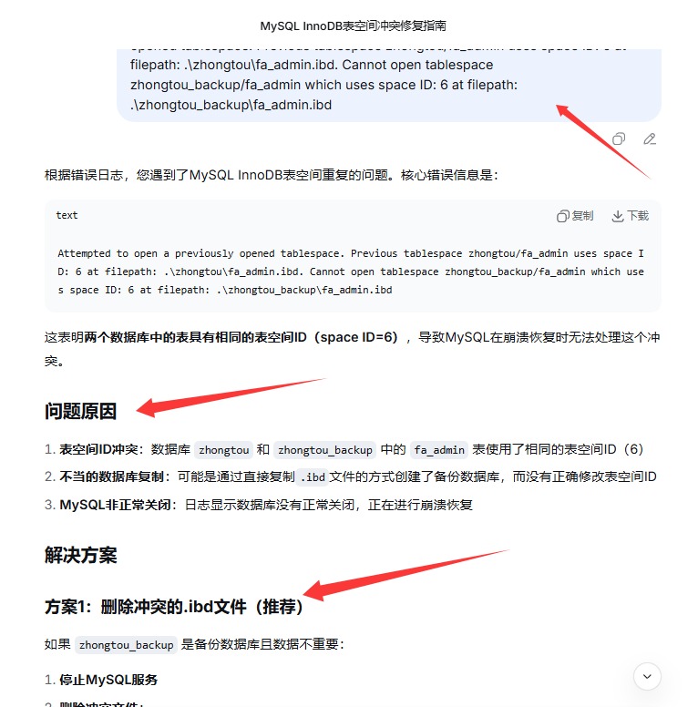 对于非技术来说,肯定是看不懂的,我们可以借助AI工具,如:deepseek,让AI帮助我们分析一下原因,将数据库中的错误日志复制到ai中: