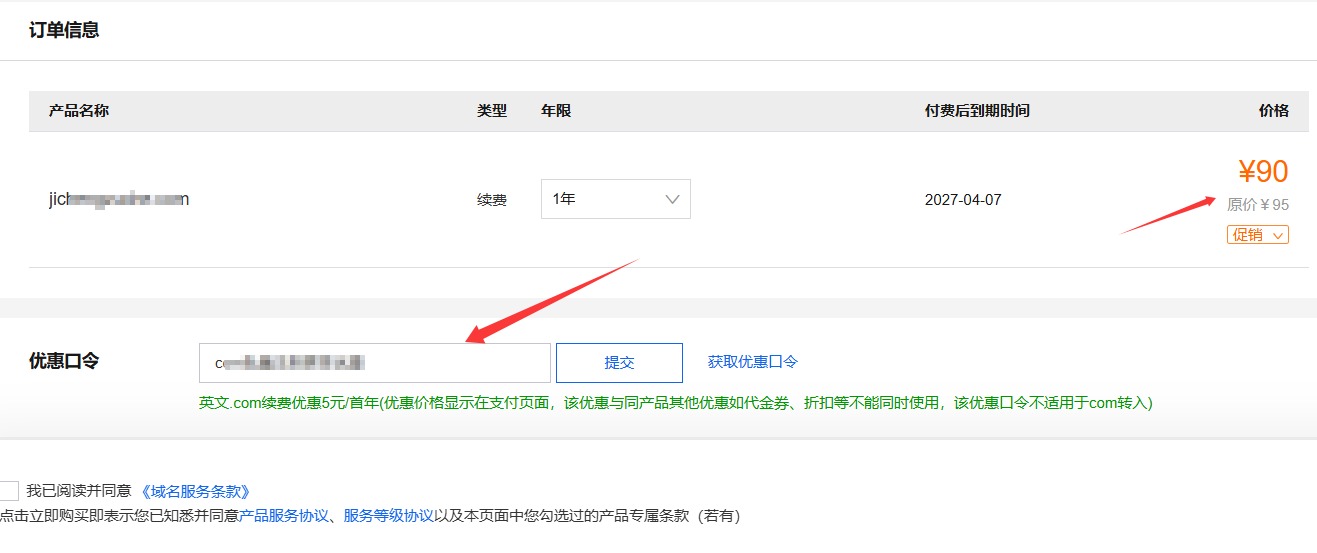 阿里云域名在注册或续费时都会有优惠,如下图,.com域名在续费时可使用优惠口令可优惠5元。