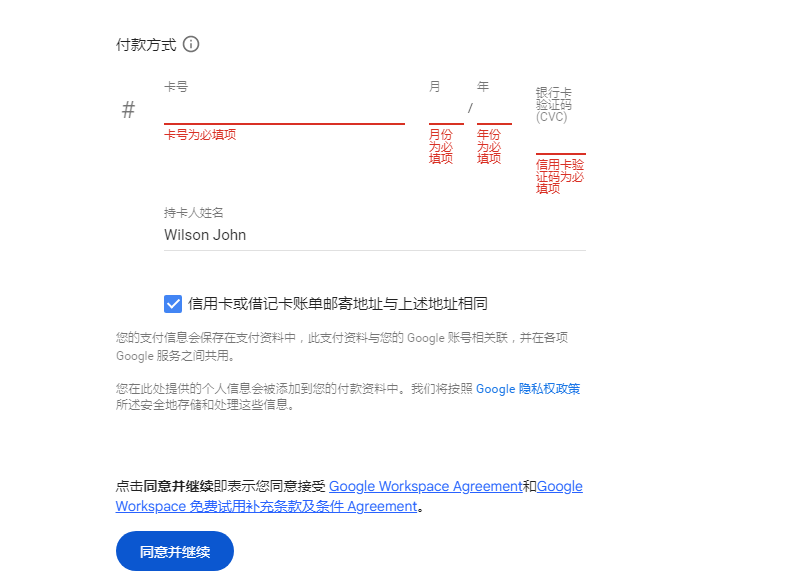 在https://workspace.google.com/官网提供14天的试用,但在注册帐户,按引导进入到填写信用卡信息时就通过不了。