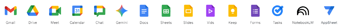 Google Workspace的应用包括:Gmail、Drive、Docs、Sheets、Slides、Meet、Calendar、Chat、Keep、Sites、Forms、Tasks、Jamboard、Gemini、NotebookLM、AppSheet、Google Vids等。